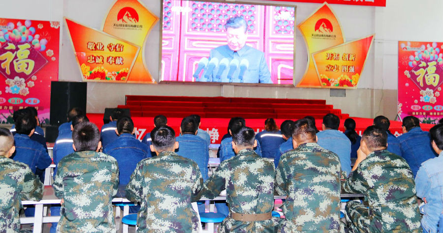 升国旗仪式结束后,公司领导和员工到职工活动中心共同观看阅兵式。