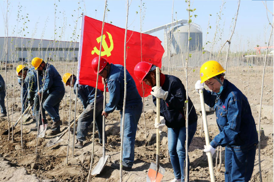 栽下一棵树苗,种下一份希望。经过2个小时的紧张奋战,一排排整齐的苗木全部植好,大家用汗水和热情践行了绿色发展理念,为绿色工厂,美丽工厂建设贡献了一份力量。